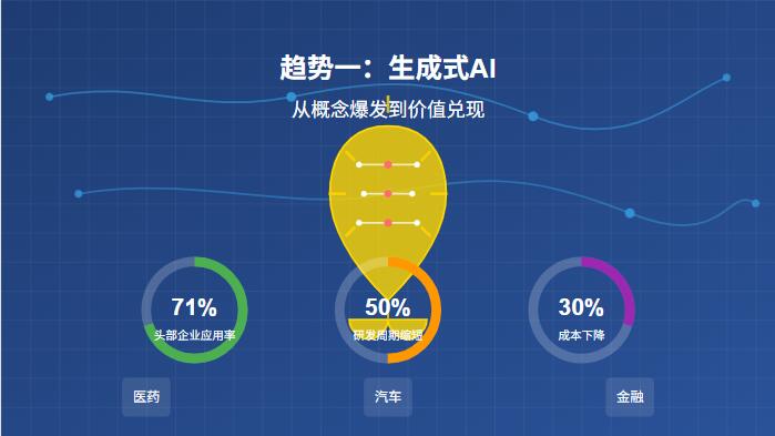 一、生成式AI:从概念爆发到价值兑现如果说2023年是生成式AI的”概念爆发年”,那么2025年已成为它的”价值兑现年”。最新统计显示,71%的头部企业已将生成式AI深度应用于产品创新全流程,从研发、设计到营销,AI正在重构传统产品开发模式。