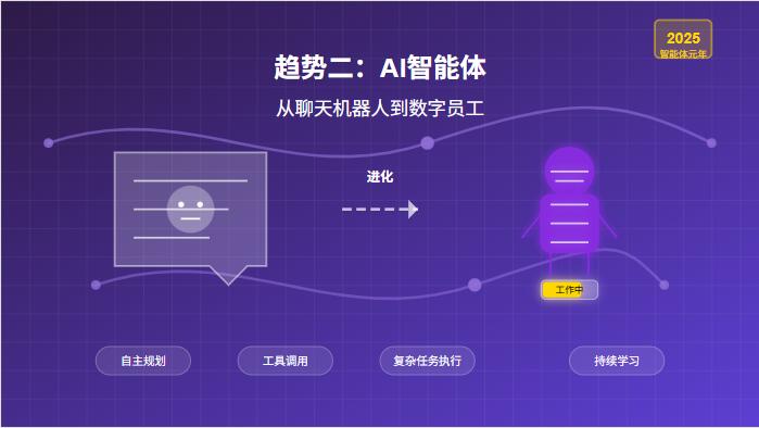 二、AI智能体:从聊天机器人到数字员工2025年被业内称为”AI智能体元年”,标志着人工智能从被动响应向主动执行的跨越。这些智能体不再只是回答问题的工具,而是能够自主规划、调用工具、执行复杂任务的”数字员工”。