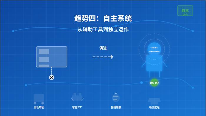 用户行为预测与个性化推荐 库存优化与供应链管理 产品定价策略动态调整 潜在风险预警与防范 四、自主系统:从辅助工具到独立运作自动驾驶汽车、智能机器人、无人机配送系统…这些曾经只存在于科幻电影中的场景,如今已在我们的生活中逐步实现。2025年,自主系统的智能化程度和应用范围都达到了新的高度。