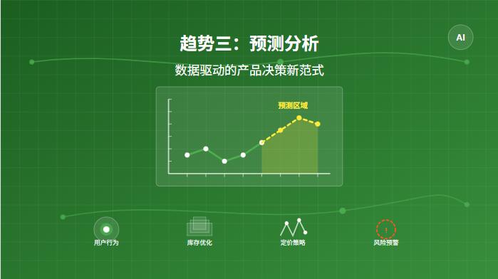 三、预测分析:数据驱动的产品决策新范式基于大数据、统计算法和机器学习技术的预测分析,正在成为产品创新的核心驱动力。通过分析历史数据,企业能够精准预测市场趋势、用户需求变化和产品生命周期,从而制定更加精准的产品策略。