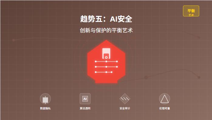生产制造:智能工厂实现无人化生产,提高效率和精度 客户服务:24/7智能客服提供个性化服务体验 产品维护:预测性维护系统减少设备故障停机时间 物流配送:智能配送网络优化路径,提高效率 五、AI安全:创新与保护的平衡艺术随着AI技术的广泛应用,信息安全(InfoSec)已成为行业关注的焦点。2025年,AI安全不再是事后补救,而是从产品设计初期就纳入考量的核心要素。